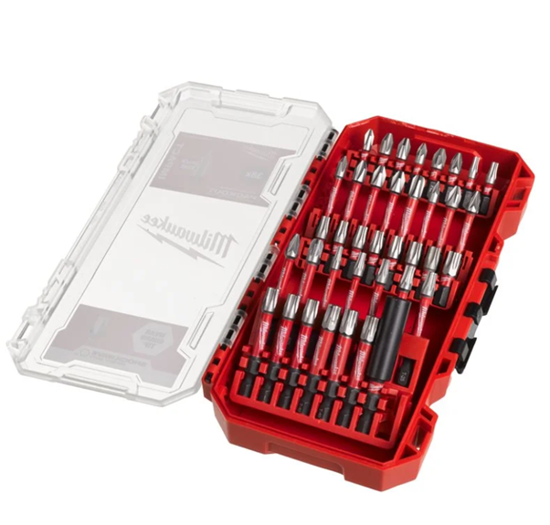 SHOCKWAVE™ screwdriving bits: 16 x 25 mm length 1 x PH1 / 2 x PH2, 1 x PZ1 / 2 x PZ2 , 1 x TX10 / 1 x TX15 / 2 x TX20 / 3 x TX25 / 2 x TX30 / 1 x TX40. 21 x 50 mm length 1 x PH1 / 3 x PH2 / 1 x PH3, 1 x PZ1 / 3 x PZ2 / 1 x PZ3, 1 x TX10 / 1 x TX15 / 1 x TX20 / 2 x TX25 / 3 x TX30 / 3 x TX40. 1 x SHOCKWAVE™ magnetic bit holder 60 mm length