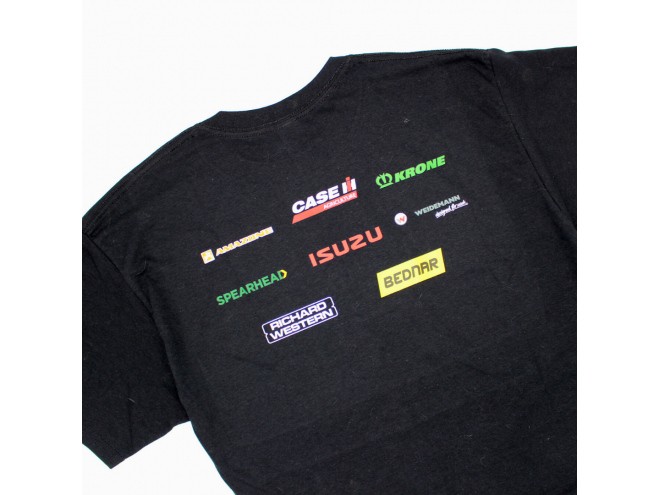 Black round neck T-Shirt with Startin Tractors Logo on the front and with various logos on the back.