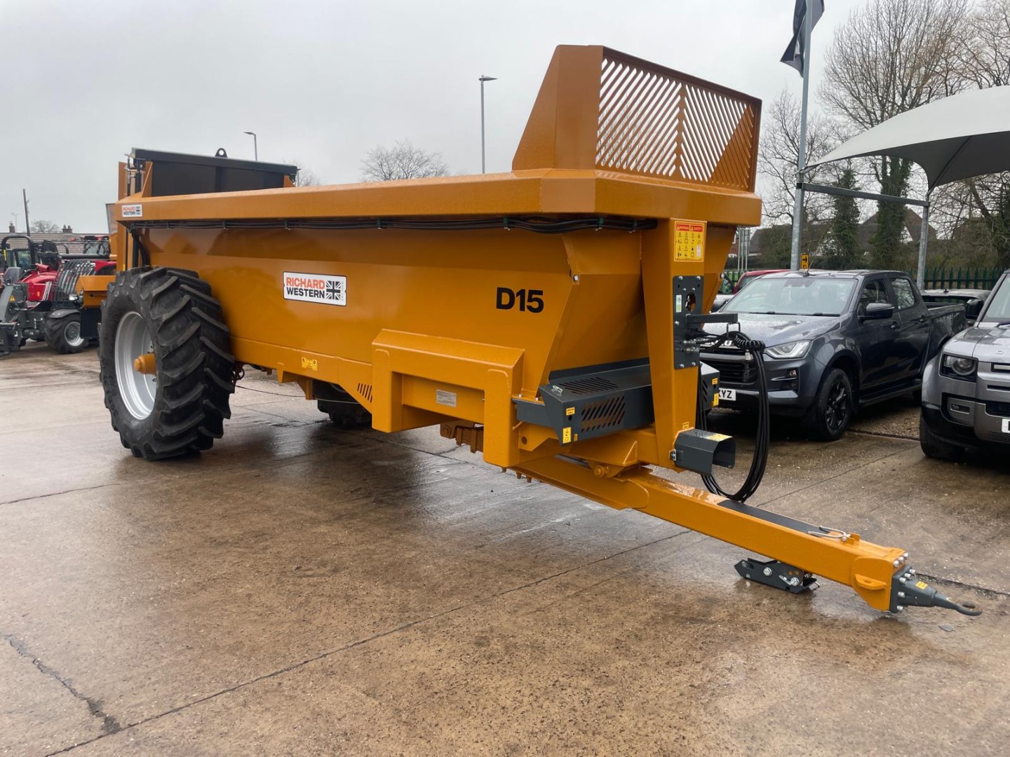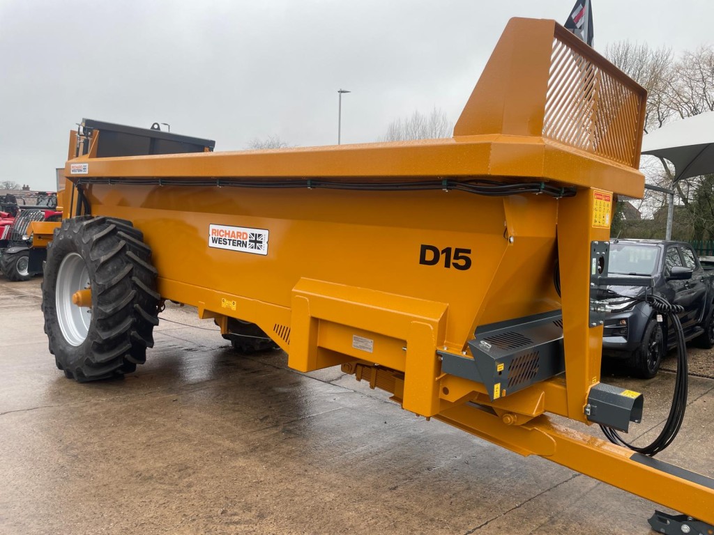 Rear vertical beaters Slurry door 580/70R38 BKT Sprung draw bar Hydraulic trailer brakes 16.6 CUB heaped